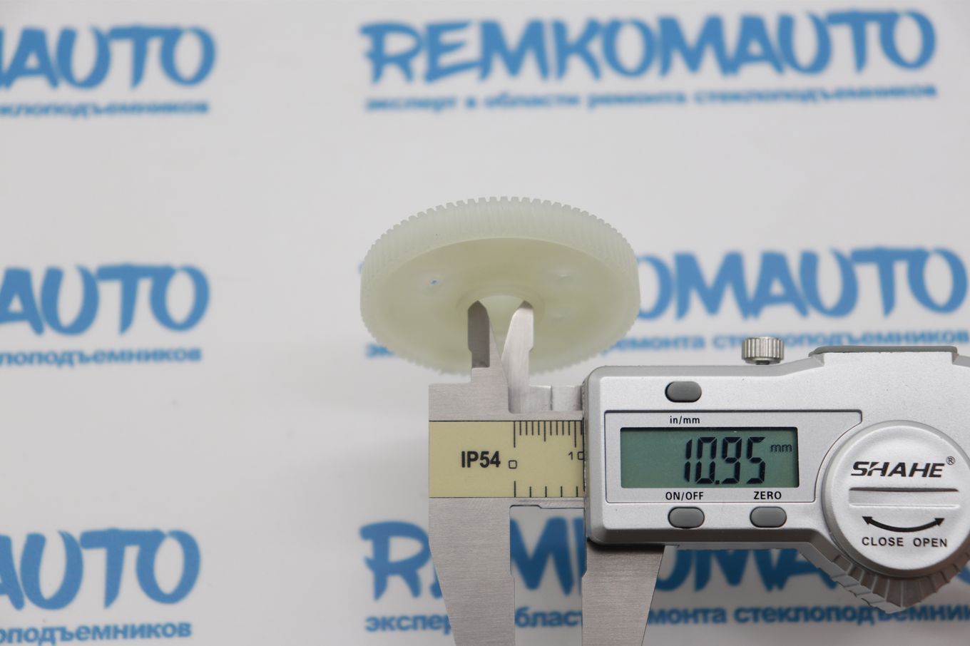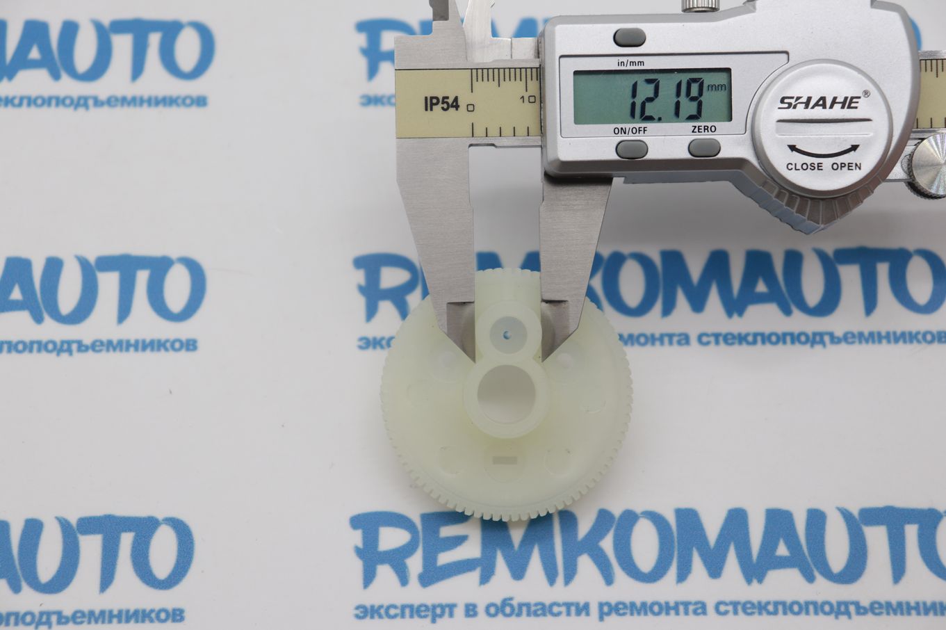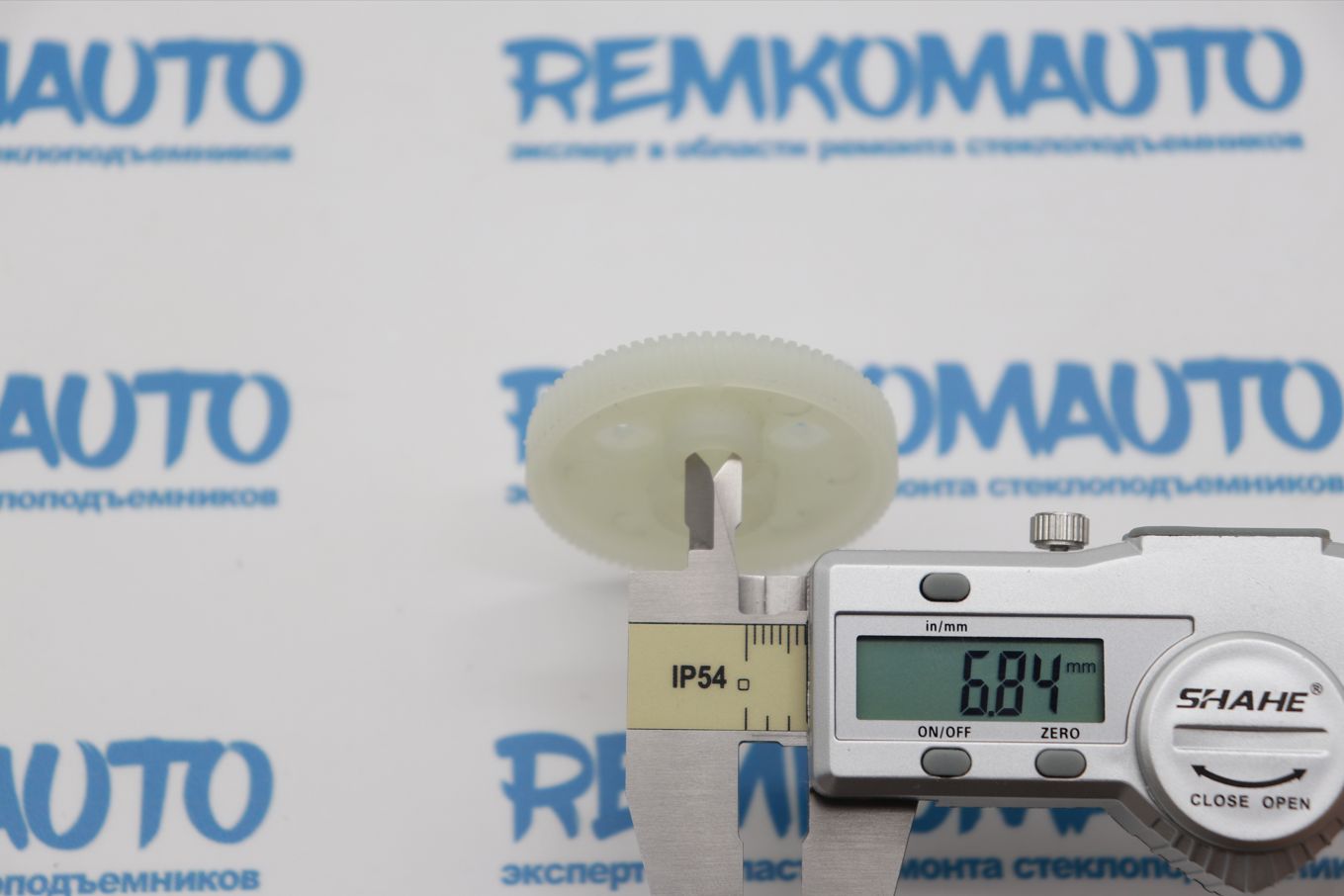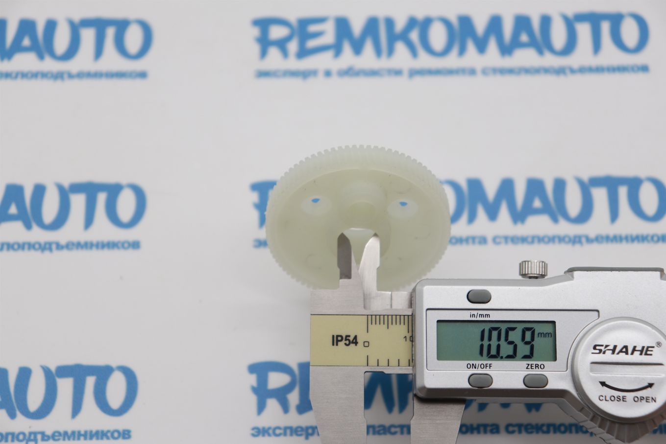 Пластикивая зубчатая шестерня с металлическим валом. Применяется в приводе люка крыши автомобиля.