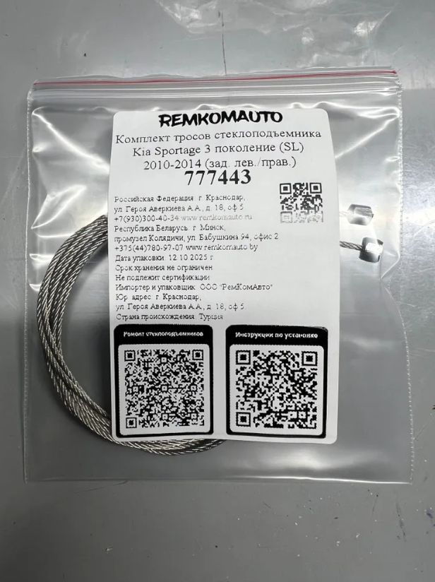 Комплект тросов стеклоподъемника Kia Sportage 3 поколение (SL) 2010-2016 (зад. лев./прав.) 777443. Комплект тросов стеклоподъемника на одну дверь. В комплекте 2 троса без оплёток. Пружин в комплекте нет. Пружины устанавливать «родные» (оригинальные). Т.к. пружины работают на растягивание, т.е. на натяжение троса. Оригинальные пружины гораздо жестче любых аналогов, это рассчитано инженерами. В следствие установки пружин-аналогов натяжение тросов падает, что сокращает срок службы и неизбежно ведет к 100% выходу из строя стеклоподъемника. При ремонте советуем заменить ролик стеклоподъемника.