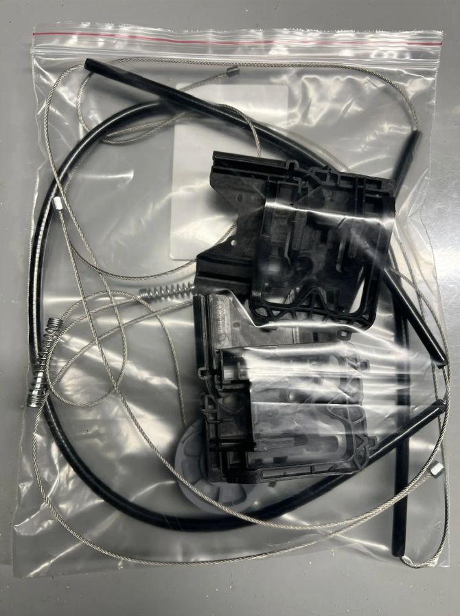 В комплекте 3 троса в оплётках, ролик (катушка) стеклоподъёмника и два направляющих держателя (каретки) стеклоподъёмника.