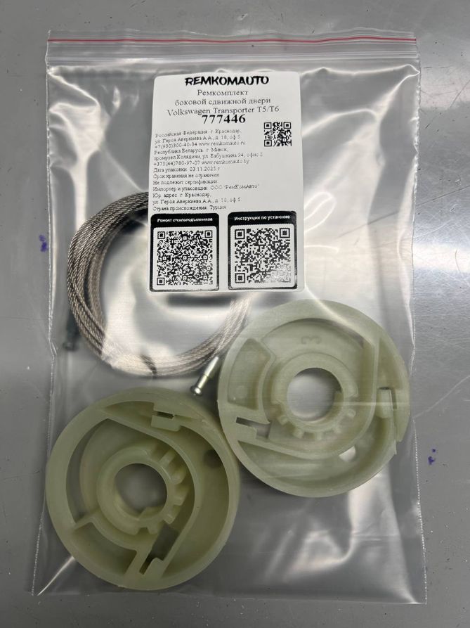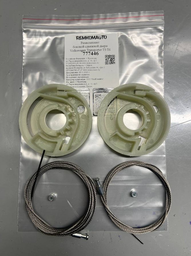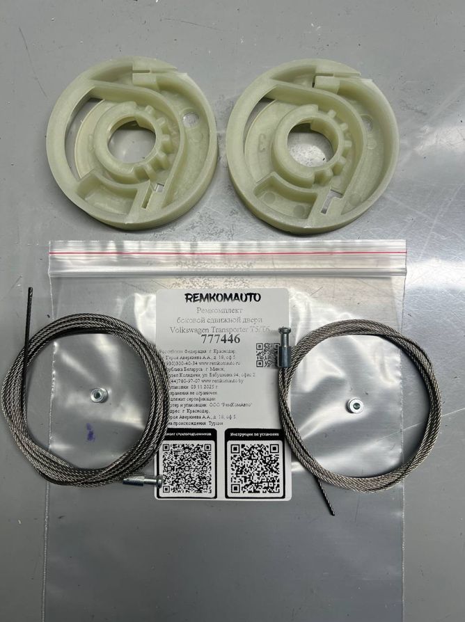Ремкомплект боковой сдвижной двери Volkswagen Transporter T5/T6 777446. Ремкомплект боковой сдвижной двери на одну дверь. В комплекте 2 троса без оплёток, 2 ролика и 2 металлических фиксатора для опрессовки тросов. !!! ВНИМАНИЕ !!! Три варианта ремкомплектов: 770173, 770175 и 777446 (данный комплект). Отличаются роликами. Перед покупкой сверяйте ролики по фото.