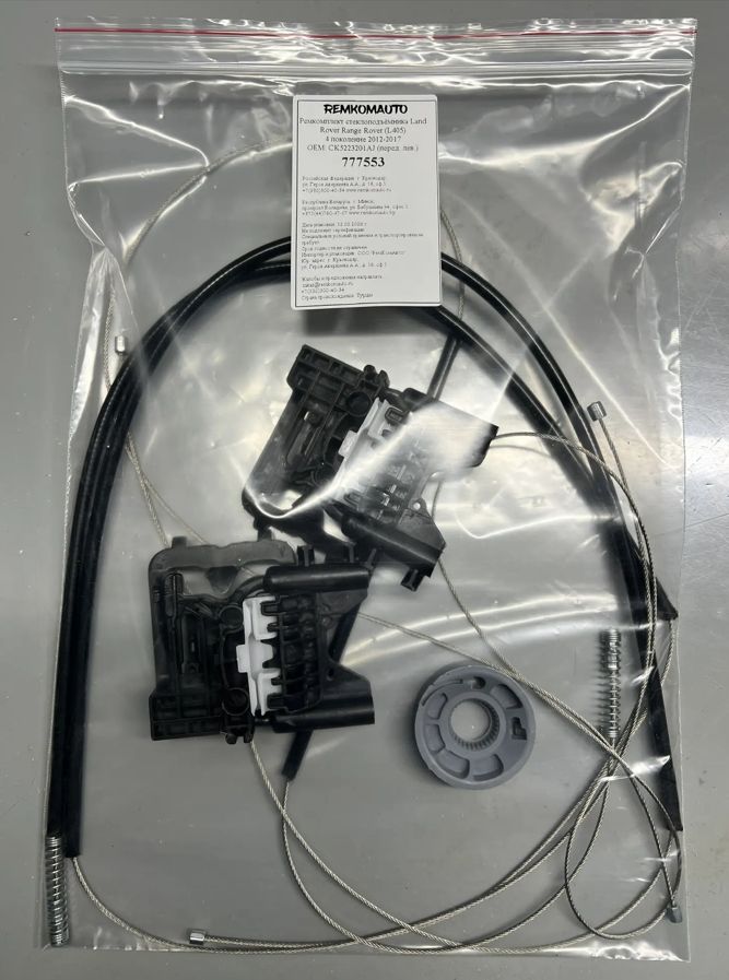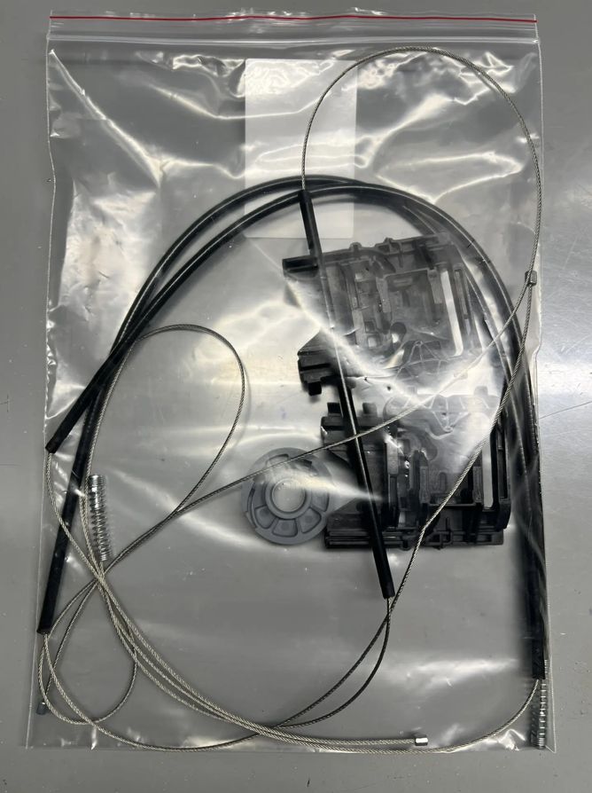 В комплекте 3 троса в оплётках, ролик (катушка) стеклоподъёмника и два направляющих держателя (каретки) стеклоподъёмника.
