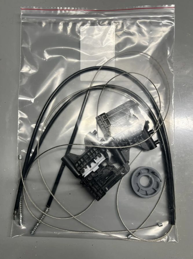 В комплекте 3 троса в оплётках, ролик (катушка) стеклоподъёмника и два направляющих держателя (каретки) стеклоподъёмника.