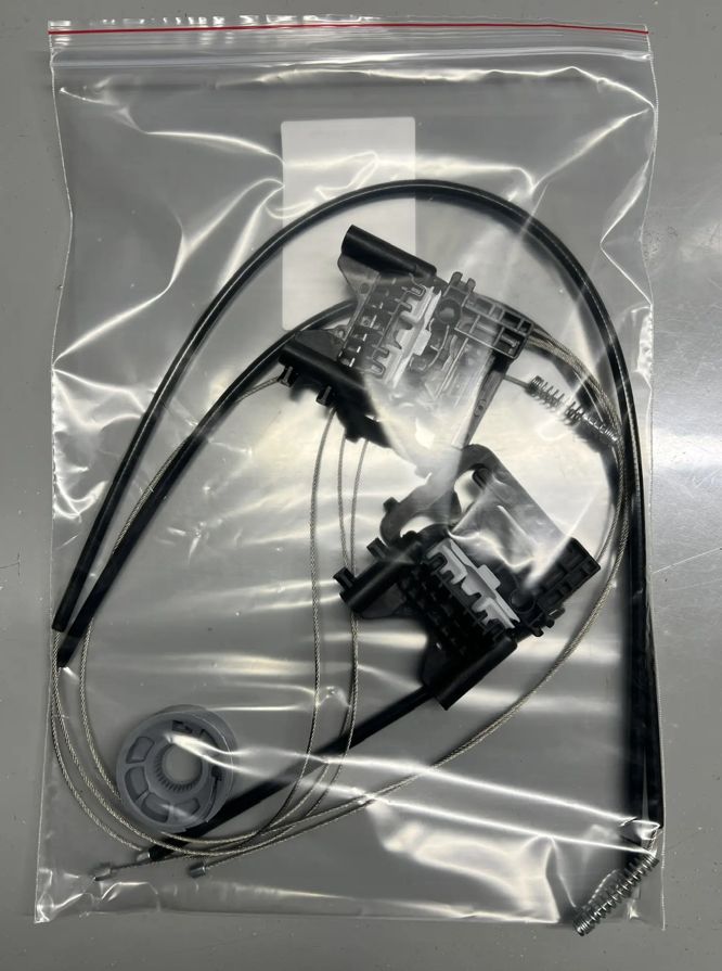 В комплекте 3 троса в оплётках, ролик (катушка) стеклоподъёмника и два направляющих держателя (каретки) стеклоподъёмника.
