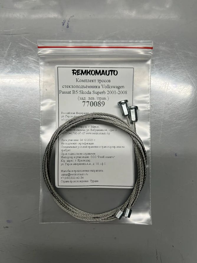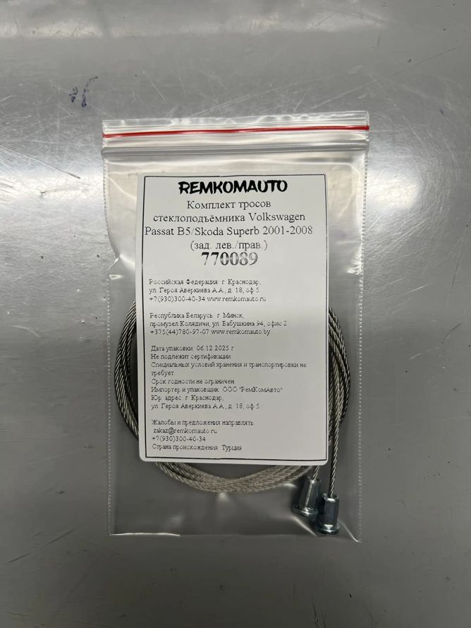 Комплект тросов стеклоподъёмника Volkswagen Passat B5/Skoda Superb 2001-2008 (зад. лев./прав) 770089. Комплект тросов стеклоподъемника на одну дверь. В комплекте 2 троса без оплёток. Пружин в комплекте нет. Пружины устанавливать «родные» (оригинальные). Т.к. пружины работают на растягивание, т.е. на натяжение троса. Оригинальные пружины гораздо жестче любых аналогов, это рассчитано инженерами. В следствие установки пружин-аналогов натяжение тросов падает, что сокращает срок службы и неизбежно ведет к 100% выходу из строя стеклоподъемника.